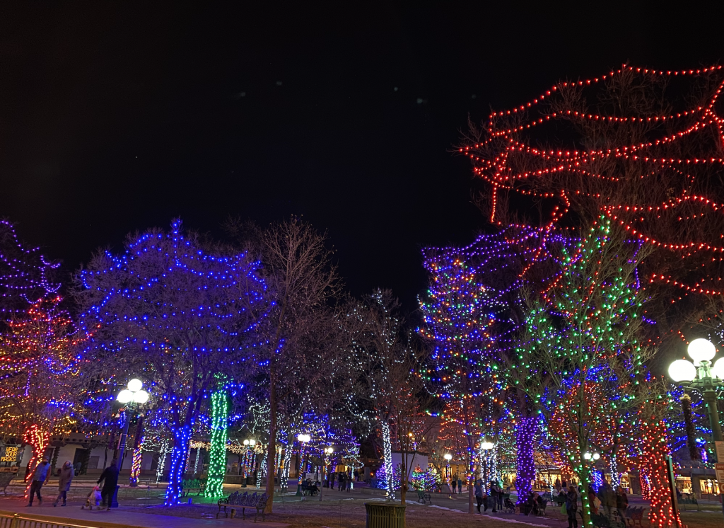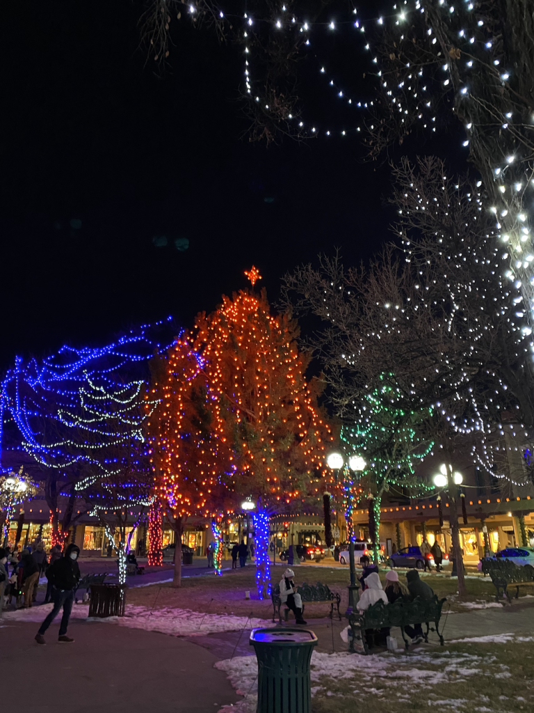 We take time to unfold so many paper bags to make our own luminarias (or farolitos), we bake up the perfect batch of biscochitos, we thaw out the hominy for posole, and we bundle up for a blistering walk down Canyon Road. All of these traditions are done with love and the spirit of Christmas in our hearts, but one of my most favorite Santa Fe traditions is taking in the beautiful lights on the plaza.