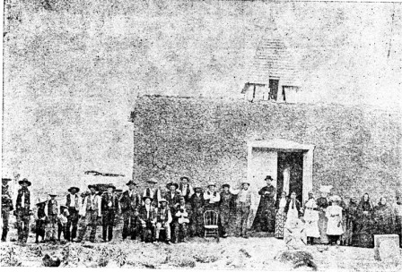 I found a photo of the original church,built in 1876. The photo caption in one book states that the man in the hat in the door is Pastor Conradus Lammert, who moved from Springer to Bueyeros on April 1, 1900, 1900 being the first year mass was offered at Bueyeros. Portions of the original Gallegos church wall were constructed with peepholes where rifles could be trained to face enemies approaching the church. The original bell supposedly came from a church near Las Vegas, New Mexico, weighing over 200 pounds and carried to Gallegos in the back of a wagon. According to several sources, the original structure was destroyed by a twister in 1909.