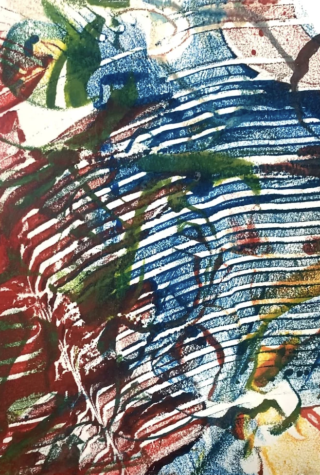 Oh dear. That’s a very complicated question. . Um, I came to New Mexico in the, uh, late 1950s as a public health nurse up in Taos County. And, um, then left there, traveled around quite a bit, um, Europe and such, and came back to going to school in, at the University of Washington, still in nursing. But through all of this, I’ve always been an artist. When I graduated from high school, I did a linoleum block print abstract when abstract expressionism was just coming out, and it won me a grand prize to college, otherwise I wouldn’t have been able to go to college. So when the, when that ran out, then I went back to nursing and, uh, kept doing art through it all. And, um, it has been a, a co-mingled thing the rest of my multiple years. It’s, um, it’s, it’s a way of, of, uh, expressing myself. And when I came to New Mexico as a public health nurse, I came back to New Mexico after all my travels and, um, uh, uh, taught nursing at the University of was, or University of New Mexico, and then also went back into competing in art competitions. I mean, it’s a very convoluted trail that I’ve left behind me. And, uh, now that I’m retired from the university, I just paint all the time. That’s when I ran into Allen. I covered him with paint,
